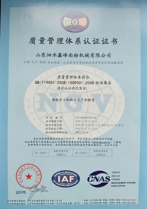 产品,小到每一个配件,大到成套设备,都必须符合国家行业标准和质量要求。因此,该公司的面粉机不仅在国内畅销20多个省市自治区,还出口亚洲、非洲、东欧、南美洲的30多个国家和地区,深受广大国内外客户好评。这是该公司获得的世界标准的质量管理体系认证证书。