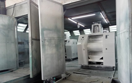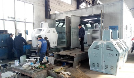 多年来,山东泗水鑫峰面粉机械有限公司在面粉机主要设备的生产过程中,既讲究加工设备的精良,使工艺精益求精,又讲究面粉机设备的自身环保和生产过程的环保。磨粉机的烤漆车间配备有专门的烤漆房,这是山东泗水鑫峰面粉机械有限公司工人们正在将完成烤漆工序的全自动气压磨粉机推出烤漆房。
