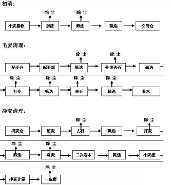 小麦清理工艺可分为初清、毛麦清理和净麦清理三道工序。