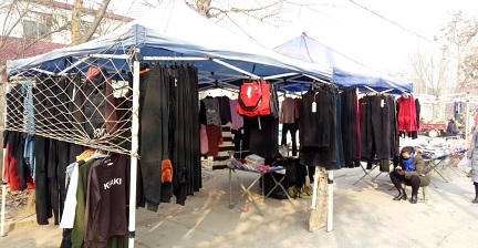 你看,这是卖成衣的摊子,你看这衣架、棚子搭得多标准。